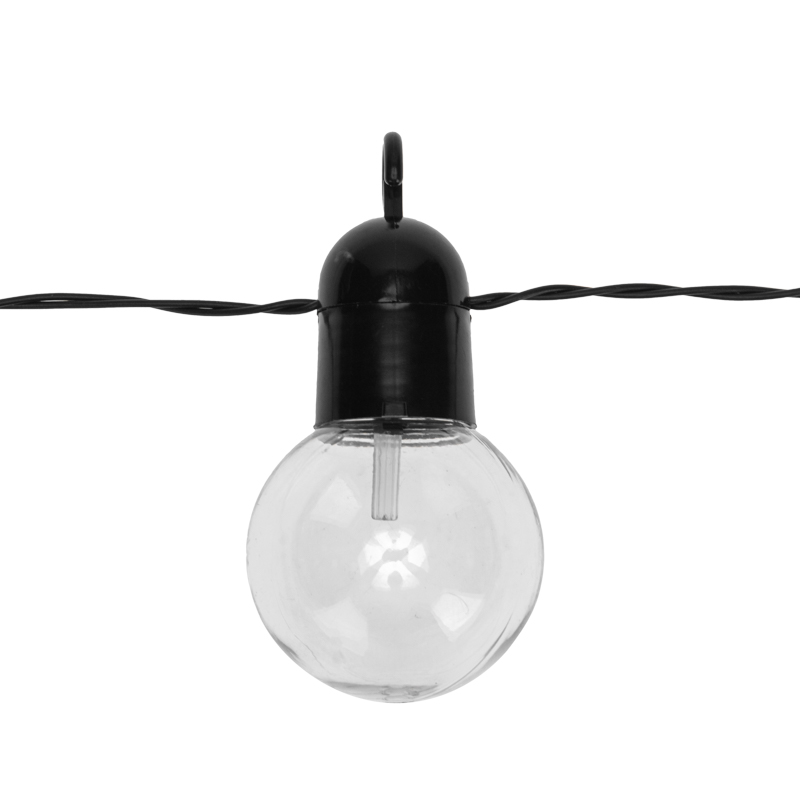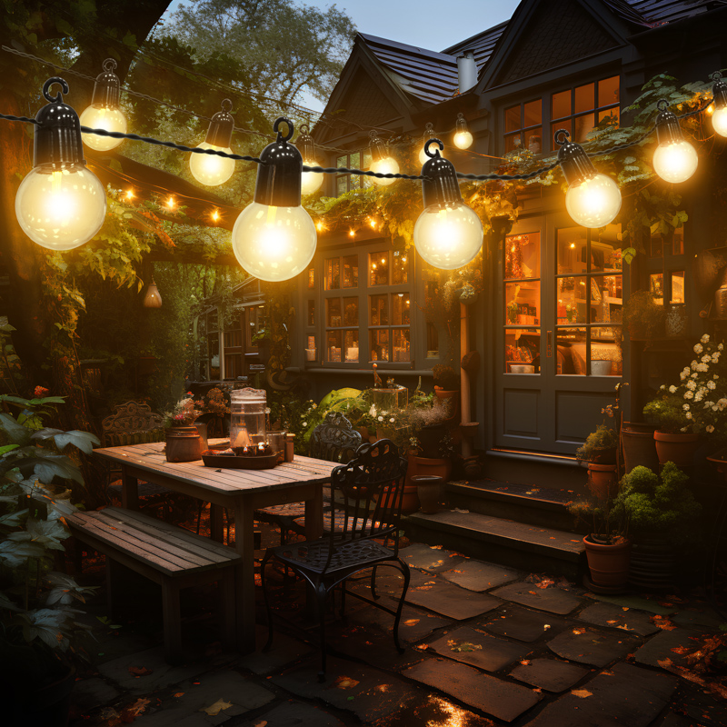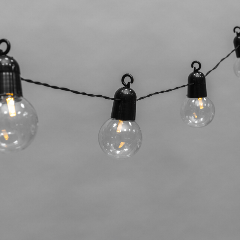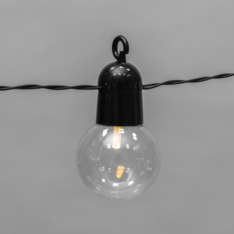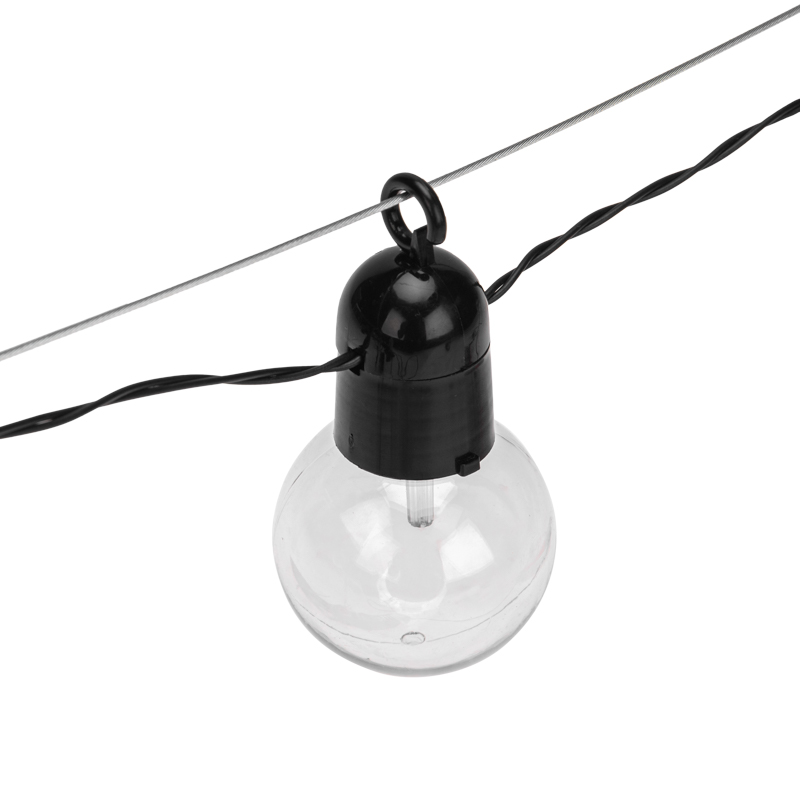 Черный провод и круглые лампочки создают уютное освещение, которое идеально подходит для создания теплой и расслабляющей обстановки.