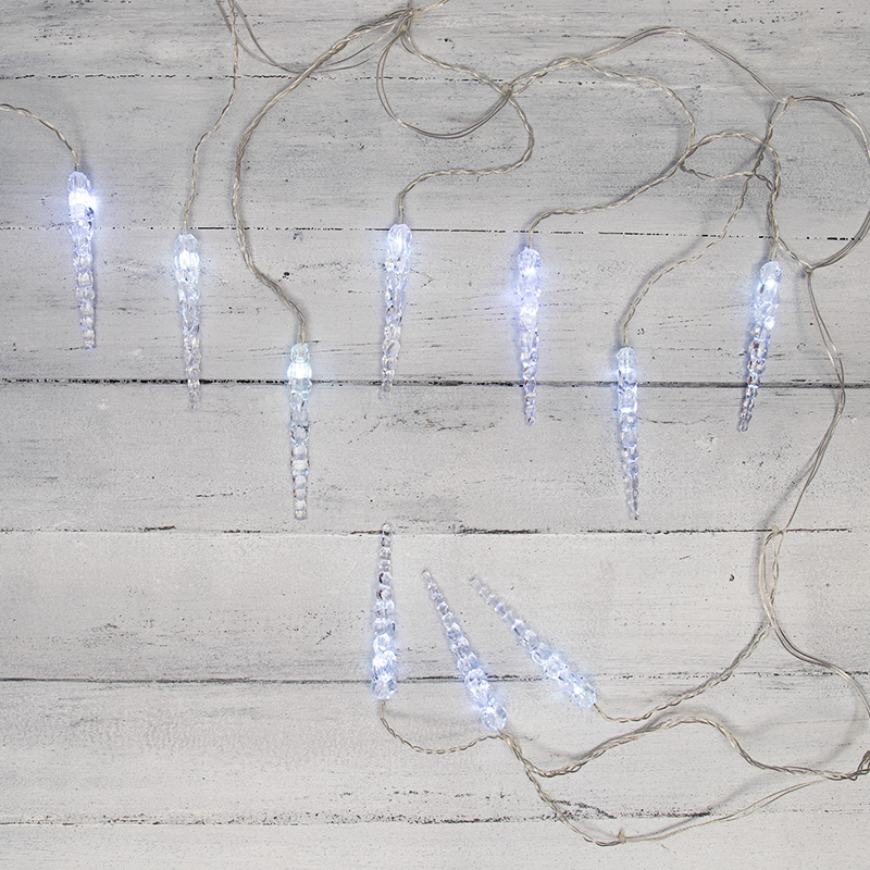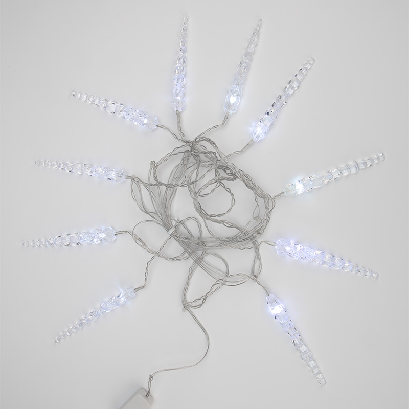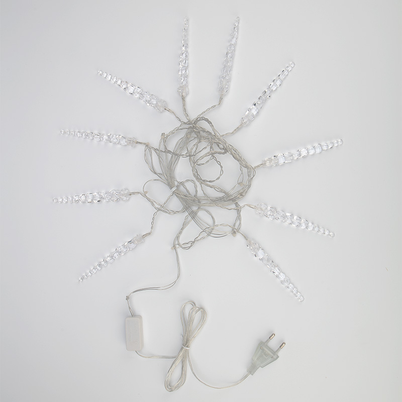 Гирлянда «Сосульки» длиной 1,5 метра, выполнена в виде ассиметричных нитей: на проводе-основе находятся 10 вертикальных отрезков по 20 и 25 сантиметров, на которых размещены 10 ярких диодов белого свечения. Электрический кабель защищен от повреждений слоем эластичной изоляции из прозрачного ПВХ. 10 насадок в виде сосулек эффектно подсвечиваются диодами, имитируя сверкание настоящего льда. Для подключения к электрической сети не понадобится удлинитель: собственная длина питающего шнура составляет 3 метра.
