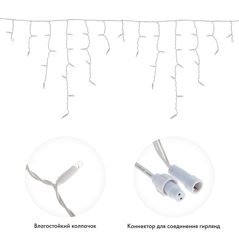 Гирлянда имитирует сосульки и может послужить оригинальным решением при украшении карнизов, арок, фасадов зданий, витрин магазинов, а также стать эффектным элементом декора внутри помещений.