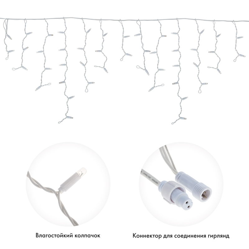 Гирлянда имитирует сосульки и может послужить оригинальным решением при украшении карнизов, арок, фасадов зданий, витрин магазинов, а также стать эффектным элементом декора внутри помещений.