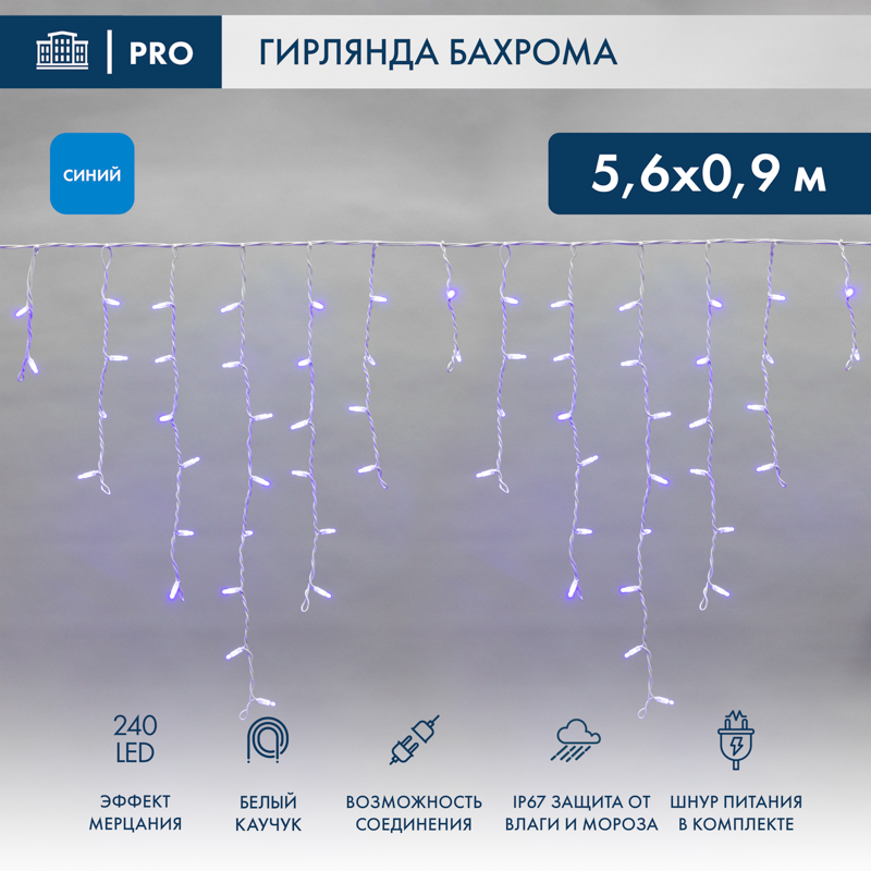 Гирлянда имеет синий цвет свечения и предназначена для использования как внутри помещений, так и снаружи.