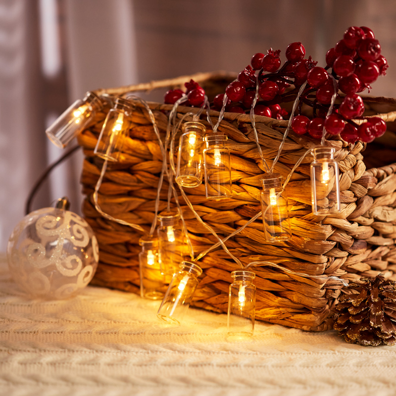 Светодиодная гирлянда «Баночки» — необычный, эффектный интерьерный декор, который украсит обстановку, подчеркнет особенности дизайна и уникальный стиль помещения. 10 насадок в виде баночек, расположенных на шнуре-основе, подсвечиваются яркими диодами, излучающими теплый белый свет. Гирлянда имеет батарейный блок и питается от двух элементов типа АА, что говорит об абсолютной безопасности изделия. Яркое оригинальное исполнение позволяет создать неповторимые акценты, которые неизменно привлекут внимание. Степень защиты IP20 предполагает домашнее использование.