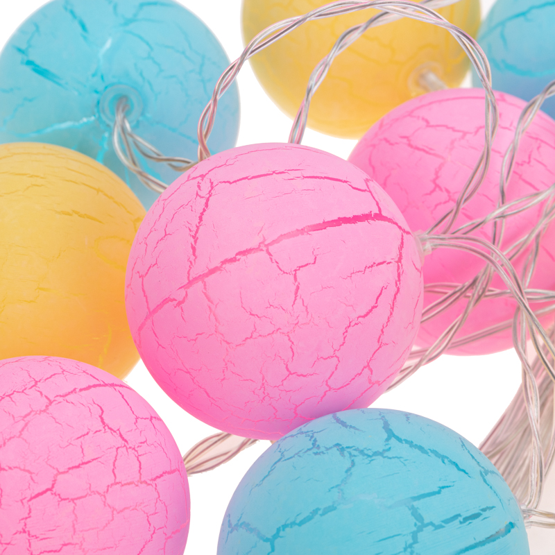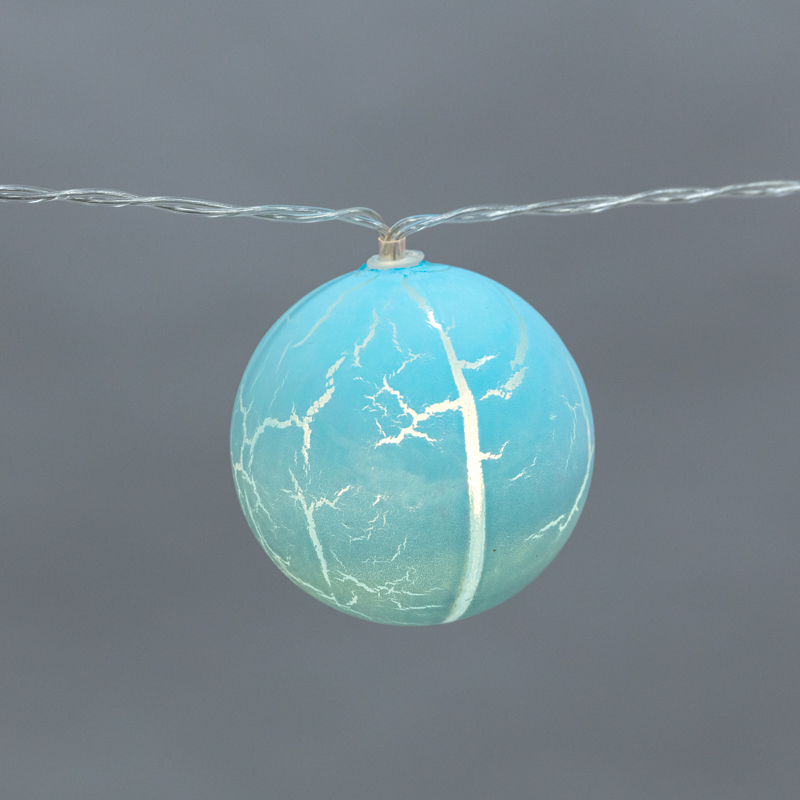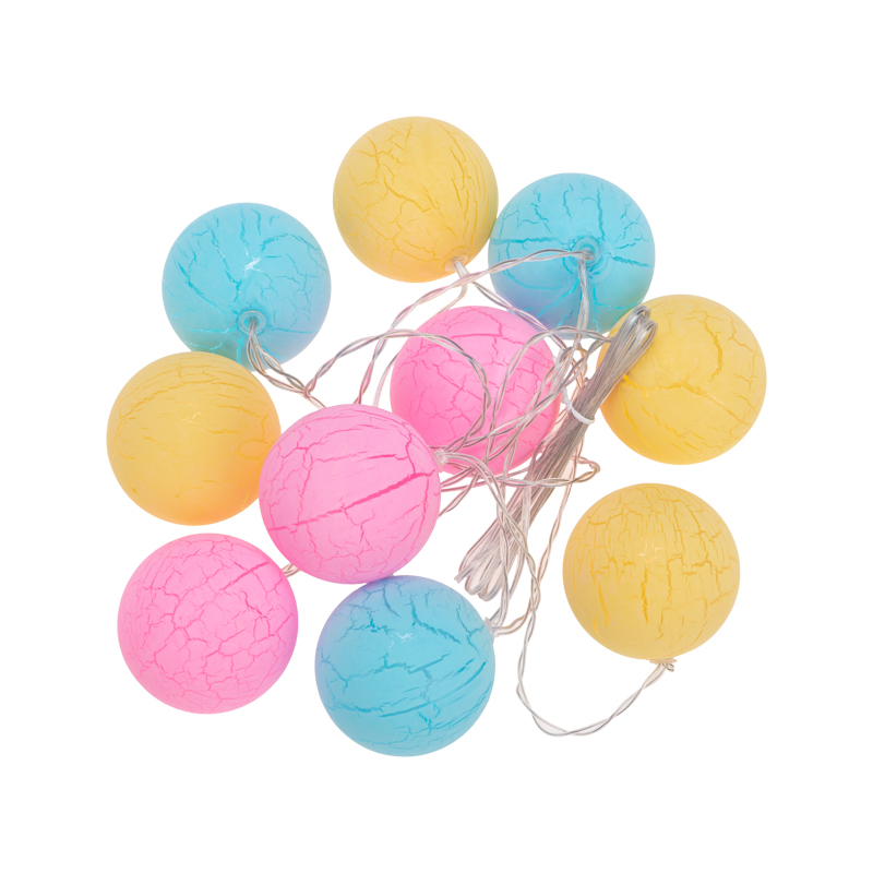 Гирлянда выполнена в виде серебристого шнура длиной 1,5 метра в прозрачной изоляции из ПВХ, на котором размещены разноцветные насадки в виде шариков диаметром 6 см.