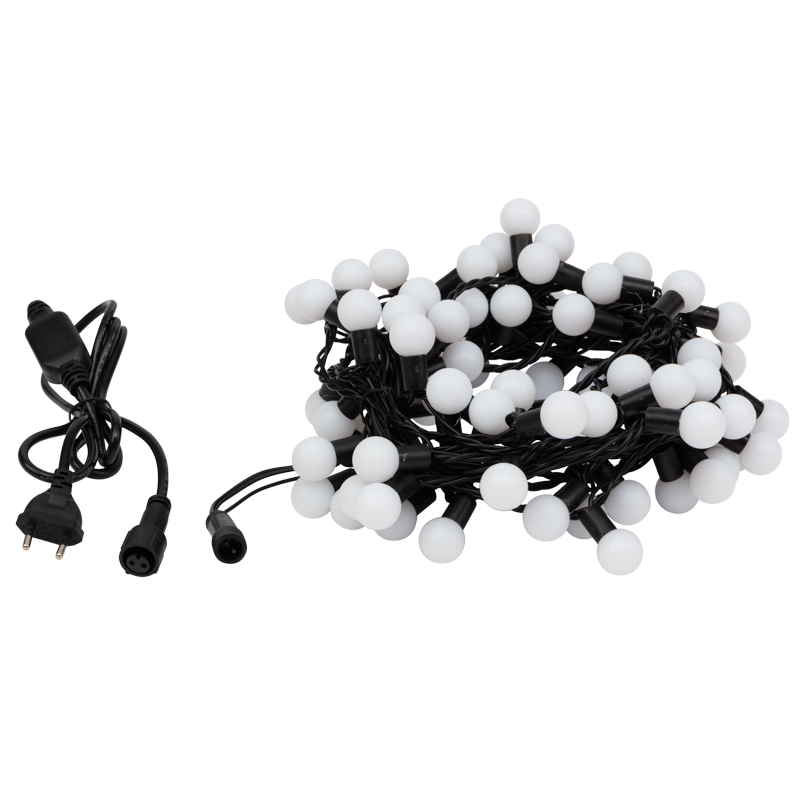 Степень влагозащиты IP65 и ПВХ-провод обеспечивают возможность использования гирлянды на открытом воздухе.