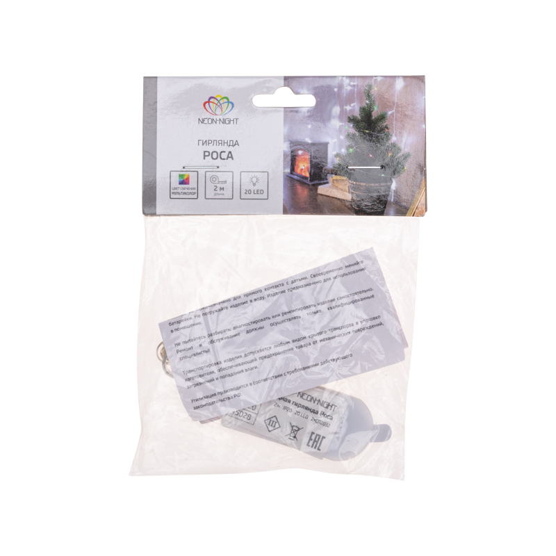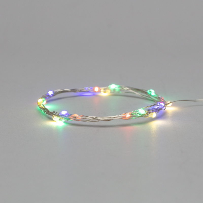Гирлянда состоит из тонкого провода длиной 2 метра, с расположенными на нем 20 разноцветными долговечными светодиодами.