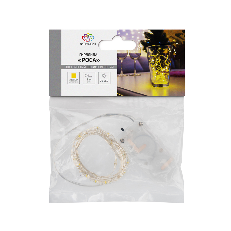 Гирлянда «Роса» длиной 2 метра питается от двух элементов типа CR2032, которые находятся в батарейном блоке на конце провода. Независимость от розетки открывает большие возможности в создании светового декора, а гибкий кабель с эффектом памяти позволяет формировать самые сложные фигуры.Благодаря абсолютной безопасности способа питания, изделие прекрасно подходит для оформления детских комнат. 20 диодов светятся яркими желтыми огнями и работают до 48 часов от одного комплекта батареек.