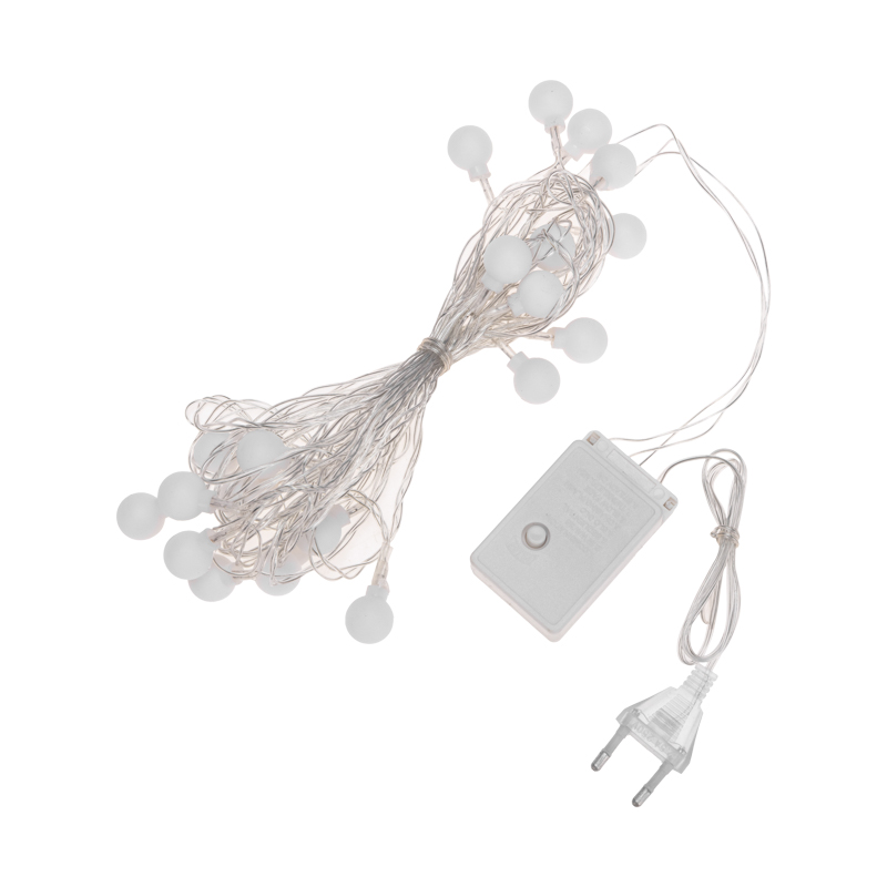 Светодиодная гирлянда Шарики длиной 5 метров выполнена в виде прозрачного ПВХ шнура с матовыми круглыми насадками, которые светятся разными цветами. Всего в гирлянде 20 экономичных светодиодов, которые не перегорают со временем и не нагреваются, поэтому украшение будет долгое время радовать своих обладателей.