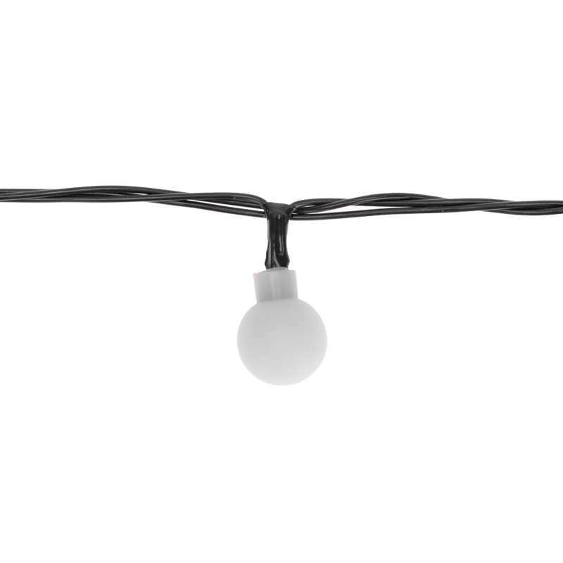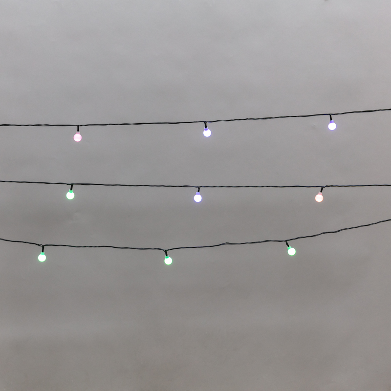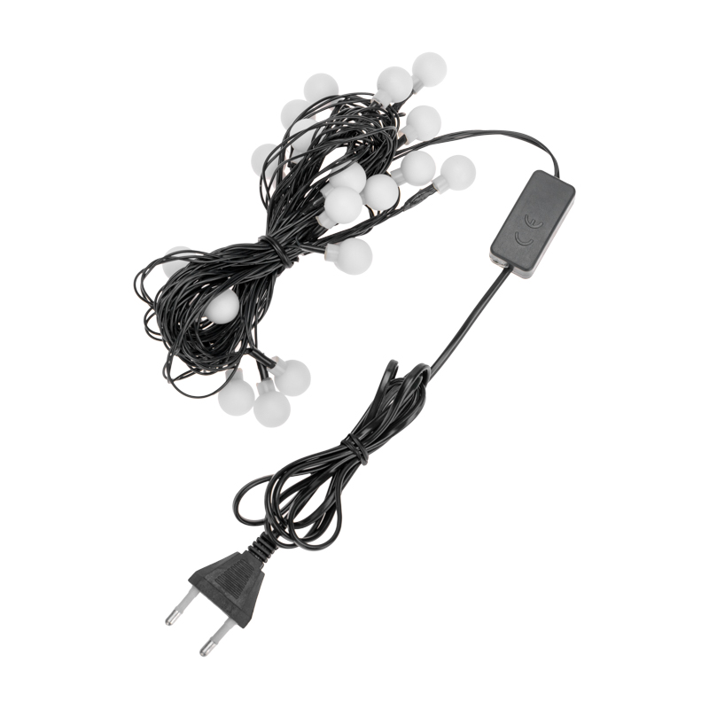 Светодиодная гирлянда Шарики длиной 5 метров выполнена в виде зеленого ПВХ шнура с матовыми круглыми насадками, которые светятся разными цветами. Всего в гирлянде 20 экономичных светодиодов, которые не перегорают со временем и не нагреваются, поэтому украшение будет долгое время радовать своих обладателей.