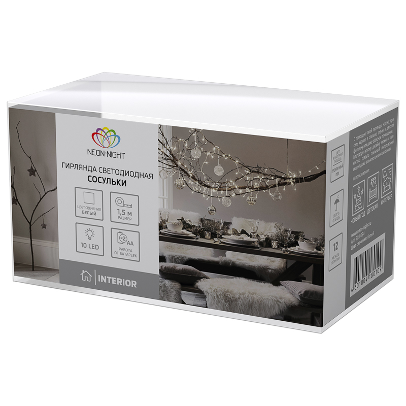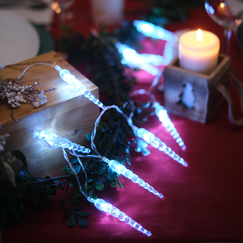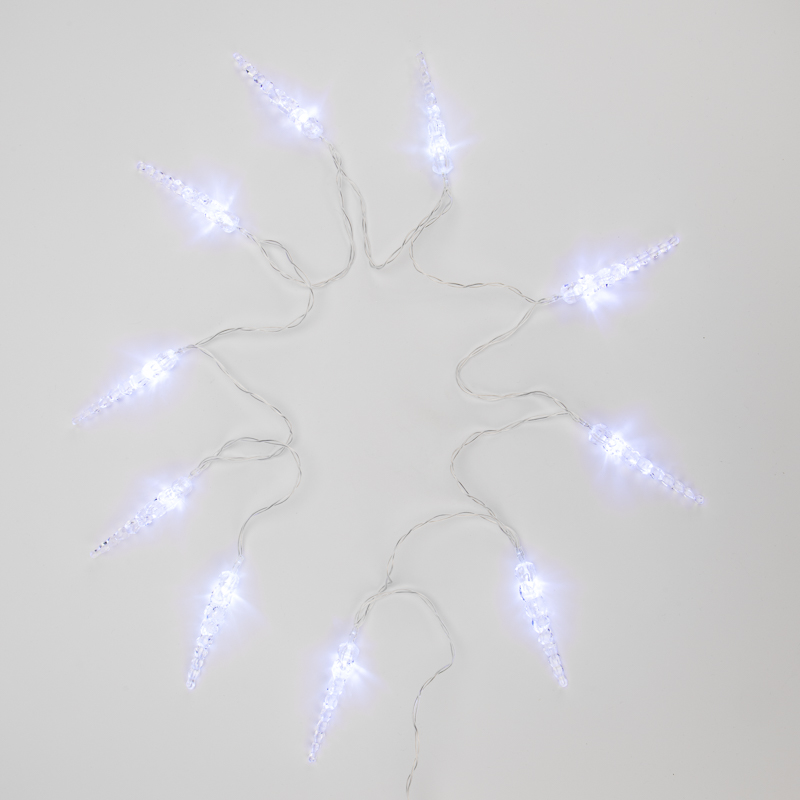 Светодиодная гирлянда «Сосульки» длиной 1,5 метра украшена пластиковыми насадками в виде ледяных сосулек, которые ярко подсвечиваются диодами. Украшение способствует созданию магической атмосферы праздника и помогает эффектно оформить интерьер. 10 сосулек расположены на расстоянии 16 сантиметров друг от друга, в качестве основы используется электрический кабель в надежной изоляции из прозрачного ПВХ. Диоды белого свечения питаются от двух батареек АА, которые помещаются в небольшой блок на конце кабеля. Безопасное изделие на батарейках — прекрасный вариант для оформления детской комнаты.