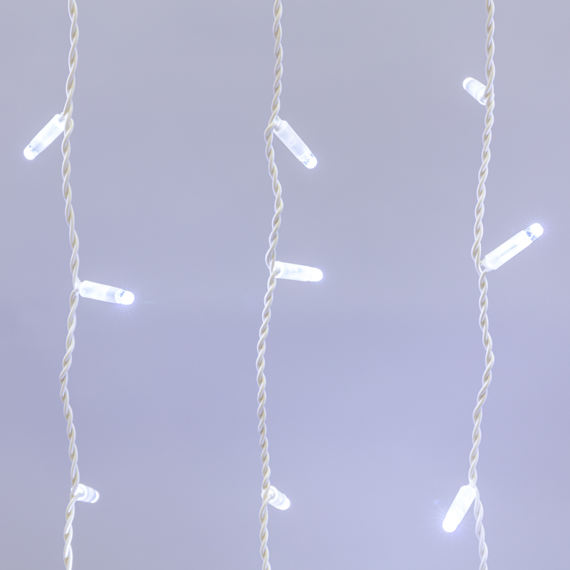 Светодиодная гирлянда Занавес (Дождь) представляет собой гибкий горизонтальный шнур-шину 2 м, к которому через определенные промежутки крепятся 20 вертикальных нитей равной длины со светодиодами.