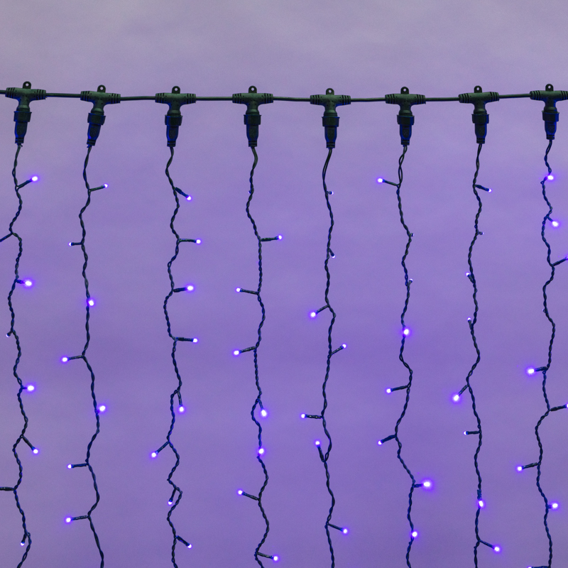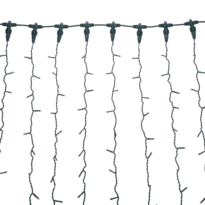 Светодиодная гирлянда Занавес (Дождь) представляет собой гибкий горизонтальный шнур-шину 2 м, к которому через определенные промежутки крепятся 20 вертикальных нитей равной длины со светодиодами.