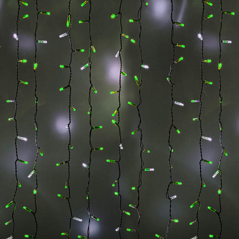 Гирлянда имеет зеленый цвет свечения и обладает эффектом мерцания.