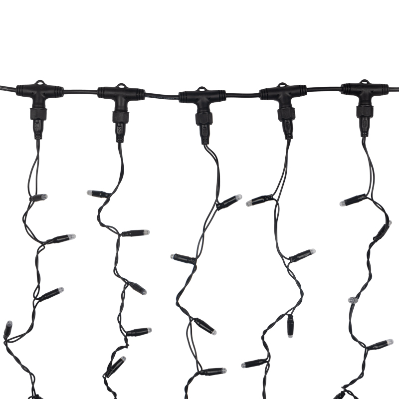 Светодиодная гирлянда Занавес (Дождь) представляет собой гибкий горизонтальный шнур-шину 2 м, к которому через определенные промежутки крепятся 20 вертикальных нитей равной длины со светодиодами.