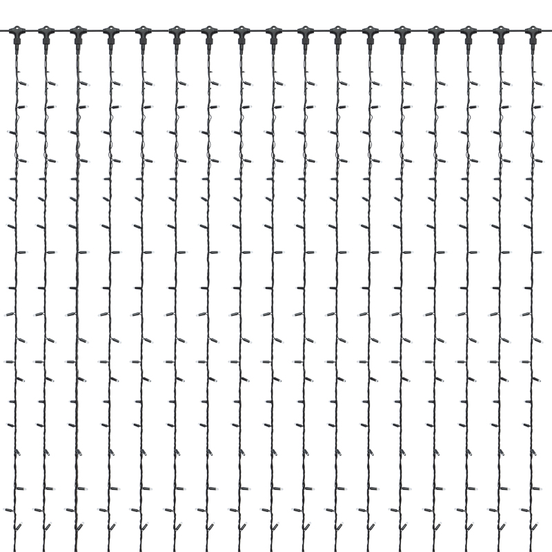 Светодиодная гирлянда Занавес (Дождь) представляет собой гибкий горизонтальный шнур-шину 2 м, к которому через определенные промежутки крепятся 20 вертикальных нитей равной длины со светодиодами.