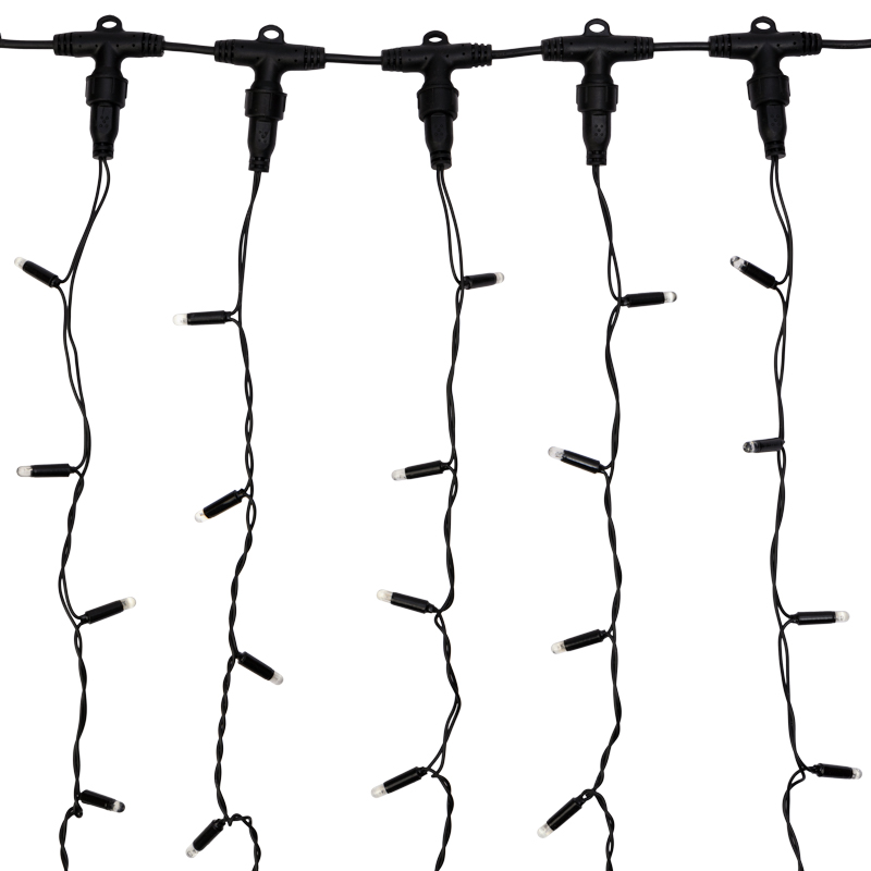 Светодиодная гирлянда Занавес (Дождь) представляет собой гибкий горизонтальный шнур-шину 2 м, к которому через определенные промежутки крепятся 20 вертикальных нитей равной длины со светодиодами.