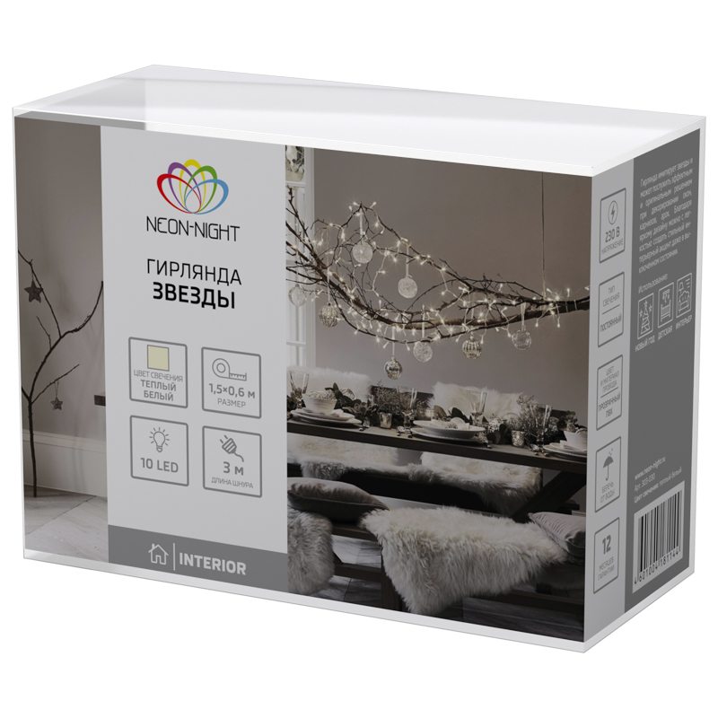 Гирлянда «Звезды» длиной 1,5 метра выполнена в виде бахромы. 10 диодов излучают белый свет теплого оттенка. Светодиоды не нагреваются, не вырабатывают вредный для зрения спектр и экономно потребляют электроэнергию. Вертикальные нити длиной 40 и 60 см удерживают 10 волшебных звезд размером 11,5 см. Гирлянда с ассиметричными нитями с защитой IP20 предназначена для использования в сухих отапливаемых помещениях и станет прекрасным украшением окна, арки, открытого дверного проема, свободного пространства между комнатами. Для подключения к розетке предусмотрен 3-метровый питающий шнур.