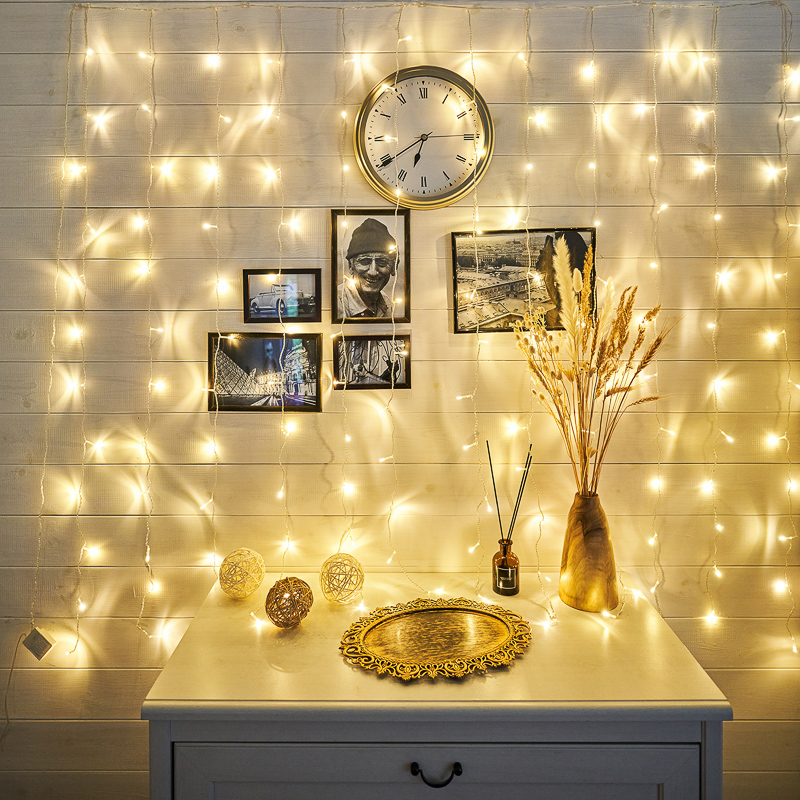 Светодиодная гирлянда NEON-NIGHT «Дождь» размером 1,5х1,5 м с контроллером подойдет для декора окон и стен в жилых и офисных помещениях. Провод в прозрачной оплетке из ПВХ сливается с общим фоном интерьерных предметов, остается практически незаметным. Гирлянда обладает 8 режимами: комбинированный, волнообразный, последовательный, перетекающий, бегущая вспышка, затухающий, мерцающий, постоянный. Диоды излучают белый свет теплого оттенка. Увеличенная длина провода питания позволяет подключать гирлянду без дополнительного удлинителя. Изделие можно крепить на стяжку (хомуты), гвозди, канцелярские кнопки.