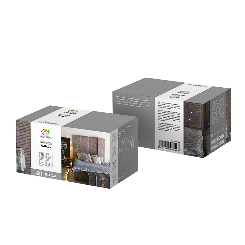 Гирлянда «Дождь» 1,5×1,5 м выполнена в виде занавеса и во включенном состоянии создает россыпь разноцветных огней, которые меняют ритм свечения под управлением контроллера. Контроллер имеет 8 режимов свечения: 7 динамических и 1 статичный. 144 ярких разноцветных светодиода, расположенных на проводе из прозрачного ПВХ, в затемненном помещении создают эффект струящегося дождя — великолепное зрелище, которое привлекает внимание и заставляет подолгу любоваться игрой света. Гирлянда подключается в электросеть 230 В при помощи шнура питания длиной 3 метра. Светодиодный занавес — идеальное решение для оформления окон.