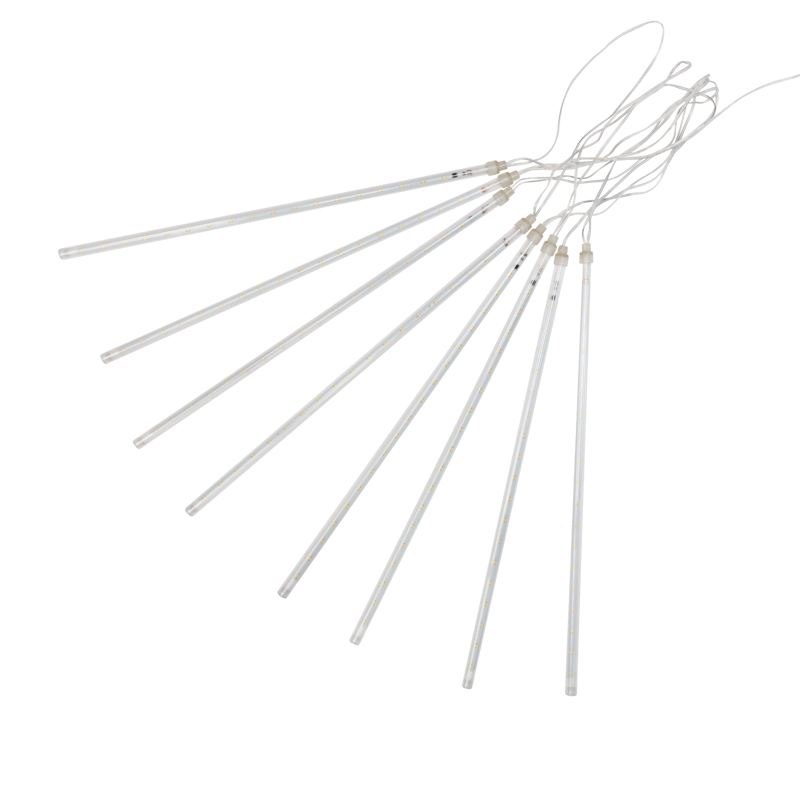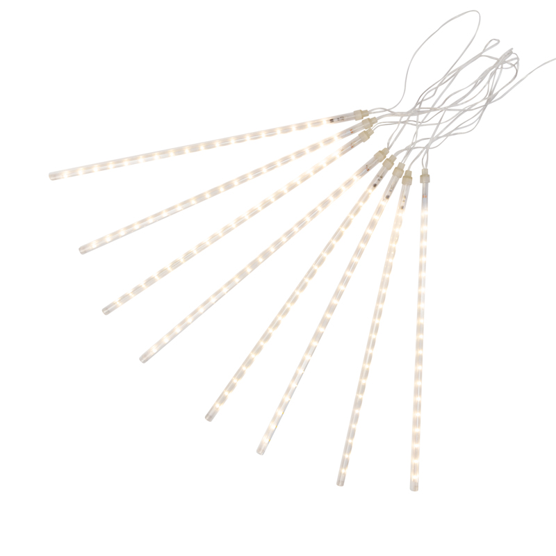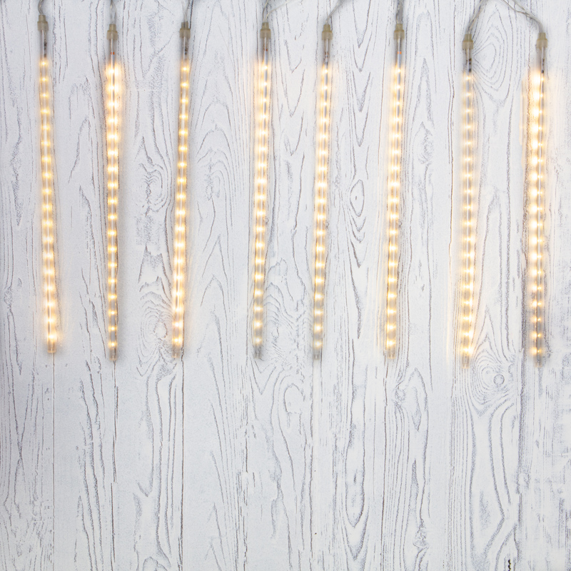 Гирлянда «Тающие сосульки» — это необычное светодиодное украшение, которое представляет собой серебристый провод в прозрачной оболочке из ПВХ, с расположенными на нем 8 декоративными элементами в виде сосулек. Каждая трубка имеет длину 50 см и содержит внутри плату с диодами, управляемую микрочипом. Светодинамический эффект имитирует стекающую каплю. Гирлянда обладает защитой IP20 и подходит для использования в помещениях с естественной влажностью. Длина питающего шнура — 1.5 метра. Для подключения в сеть с напряжением 230 В
