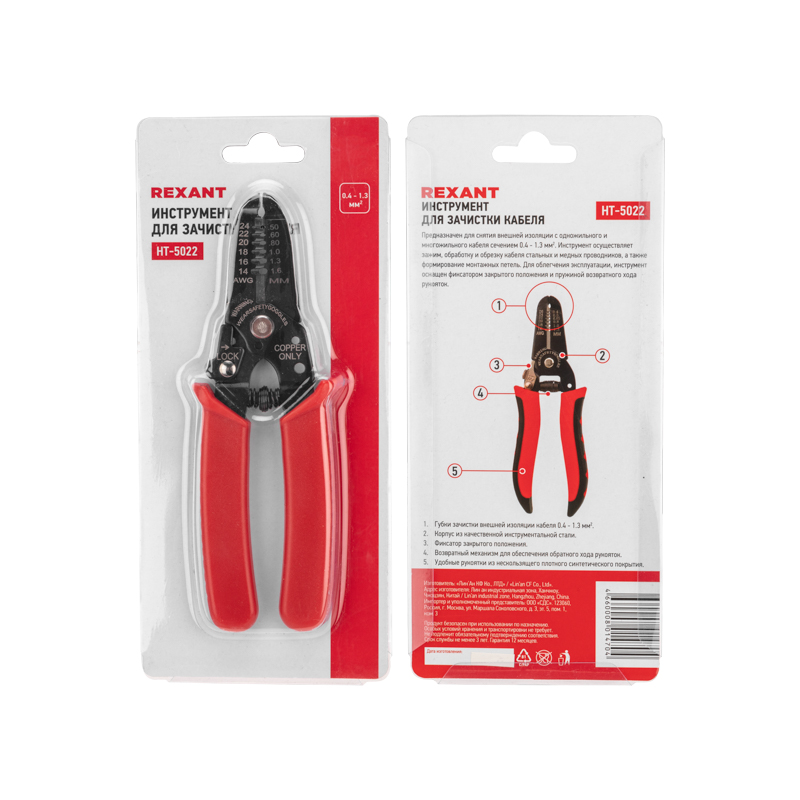 Стриппер HT-5022 предназначен для снятия внешней изоляции одножильного и многожильного кабеля сечением 0,5–1,6 мм². Также инструмент осуществляет зажим, обработку и обрезку кабеля стальных и медных проводников, формирование монтажных петель.