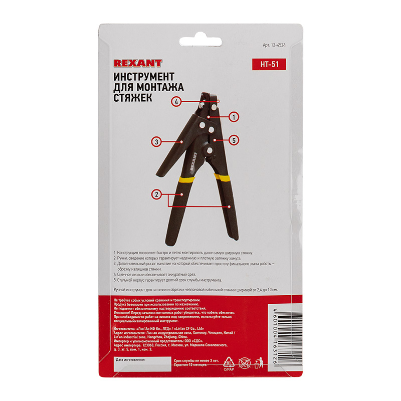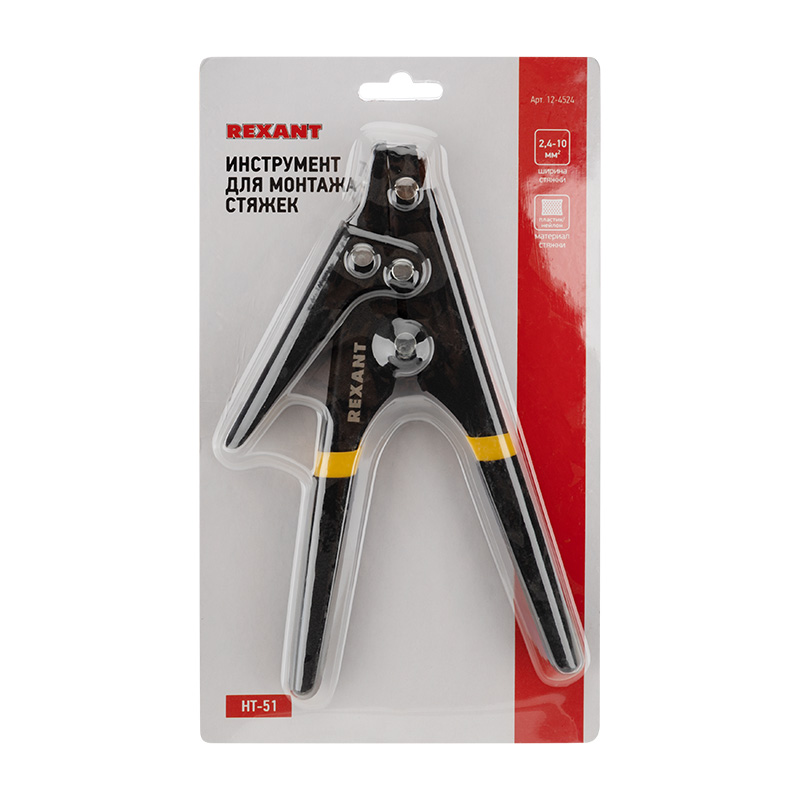 Монтажный инструмент HT-51 предназначен для затяжки и обрезки пластиковых и нейлоновых стяжек шириной 2,4–10 мм. Конструкция позволяет одним сведением ручек затягивать стяжку и обрезать излишки полотна нажатием на дополнительный рычаг.