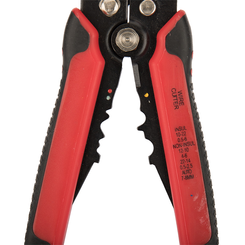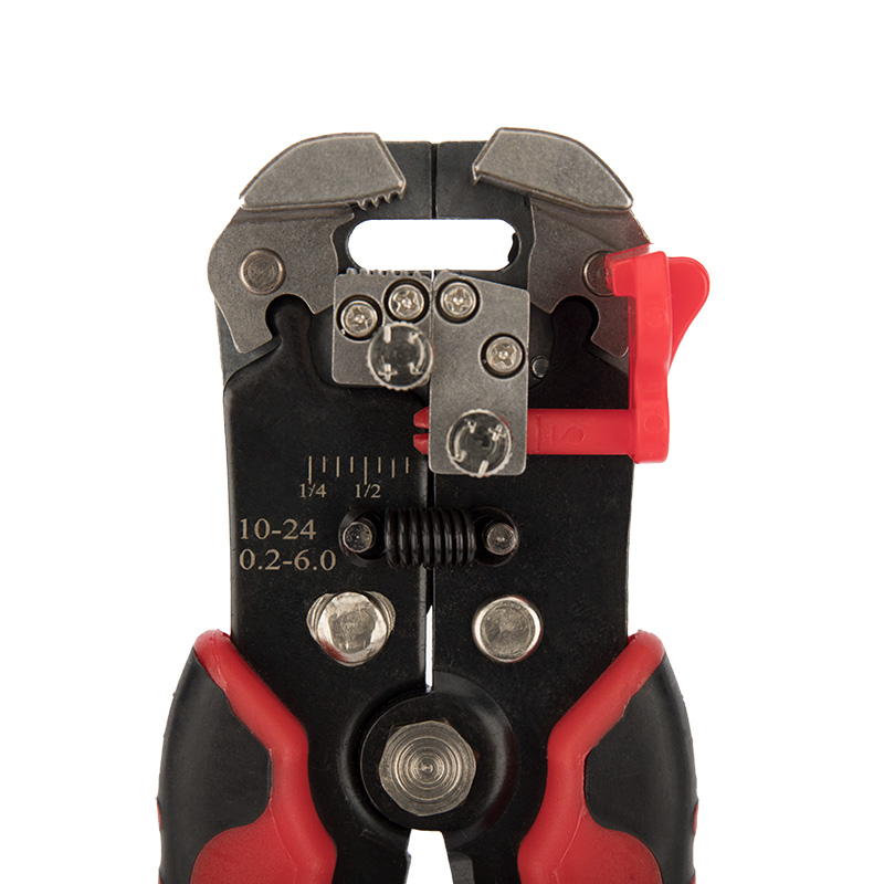 Корпус стриппера изготовлен из высокопрочной инструментальной стали, благодаря чему устойчив к механическим воздействиям и имеет продолжительный срок службы. В конструкции стриппера предусмотрен ограничитель длины зачистки провода и возвратная пружина, которая обеспечивает обратный ход рукояток и упрощает процесс работы с инструментом. Регулятор усилия зажима провода позволяет адаптировать инструмент под различные типы и размеры изоляции и не повредить сам провод при снятии изоляции. Также стриппер оснащен режущей кромкой для равномерной обрезки проводников. Двухкомпонентные защитные рукоятки с резиновыми вставками не дают инструменту выскальзывать из руки при работе.