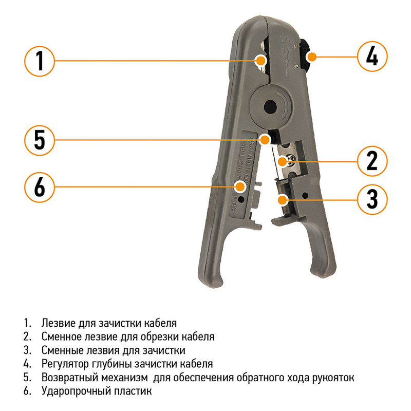 Корпус инструмента изготовлен из ударопрочного и износостойкого полиамидного пластика. Возможность замены лезвий для обрезки и зачистки кабеля позволяет эксплуатировать инструмент длительное время. Лезвия сменного типа изготовлены из нержавеющей стали, благодаря чему не подвержены коррозии. Оснащен регулировочным колесом для изменения глубины прорезания изоляции, что исключает вероятность повреждение жил кабеля. В корпус встроена возвратная пружина, которая обеспечивает обратный ход рукояток и упрощает процесс работы с инструментом. Пластиковые рукоятки благодаря специальной форме удобно лежат в руке и обеспечивают легкую и приятную работу с инструментом.
