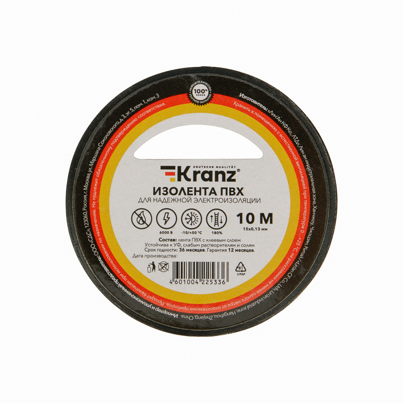 Изолента ПВХ 0,13х15мм, 10м, черная KRANZ