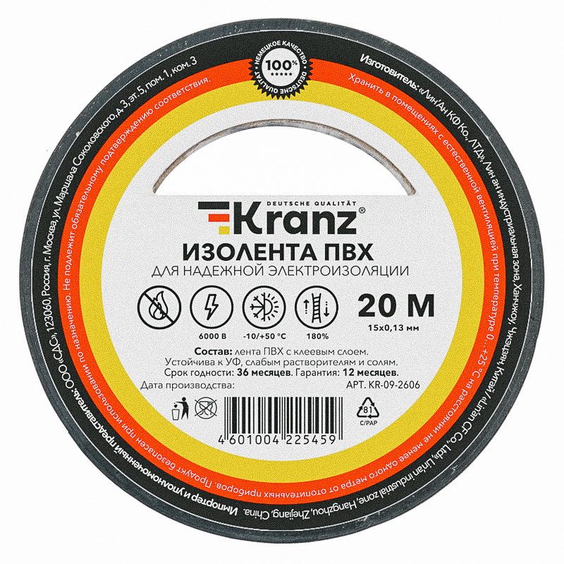 Изолента ПВХ 0,13х15мм, 20м, черная KRANZ
