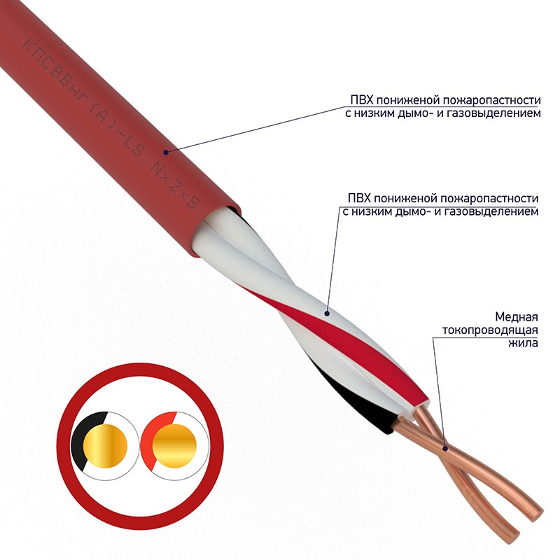 2 однопроволочные токопроводящие жилы сечением 0,75 мм² выполнены из меди и подвергнуты 100% отжигу, благодаря чему кабель становится мягче, что упрощает процесс монтажа и увеличивает срок службы. Жилы изолированы поливинилхлоридным пластикатом пониженной пожароопасности и скручены между собой, что увеличивает дальность сигнала и снижает наводку.