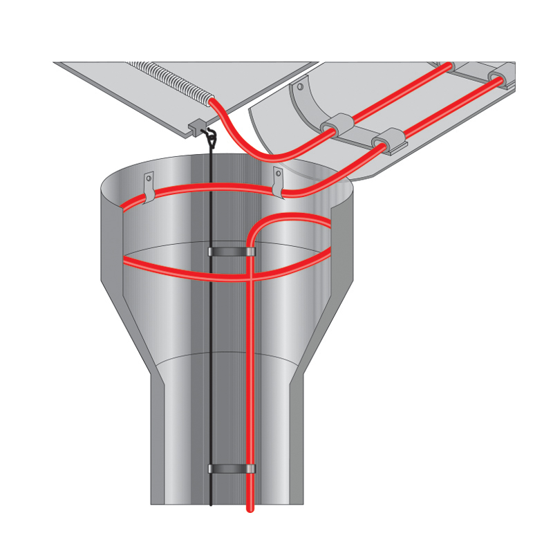 Для крепления греющего кабеля на элементах кровли применяют перфорированную монтажную ленту, зажимы, тросы и пластины, саморезы, а также монтажную сетку. Вид крепежа определяется в первую очередь длиной обогреваемой части объекта, а также его типом (на металлической или мягкой и мембранной кровле, в ендове, в водосточной трубе). Монтаж на трубу осуществляется под теплоизоляцию.