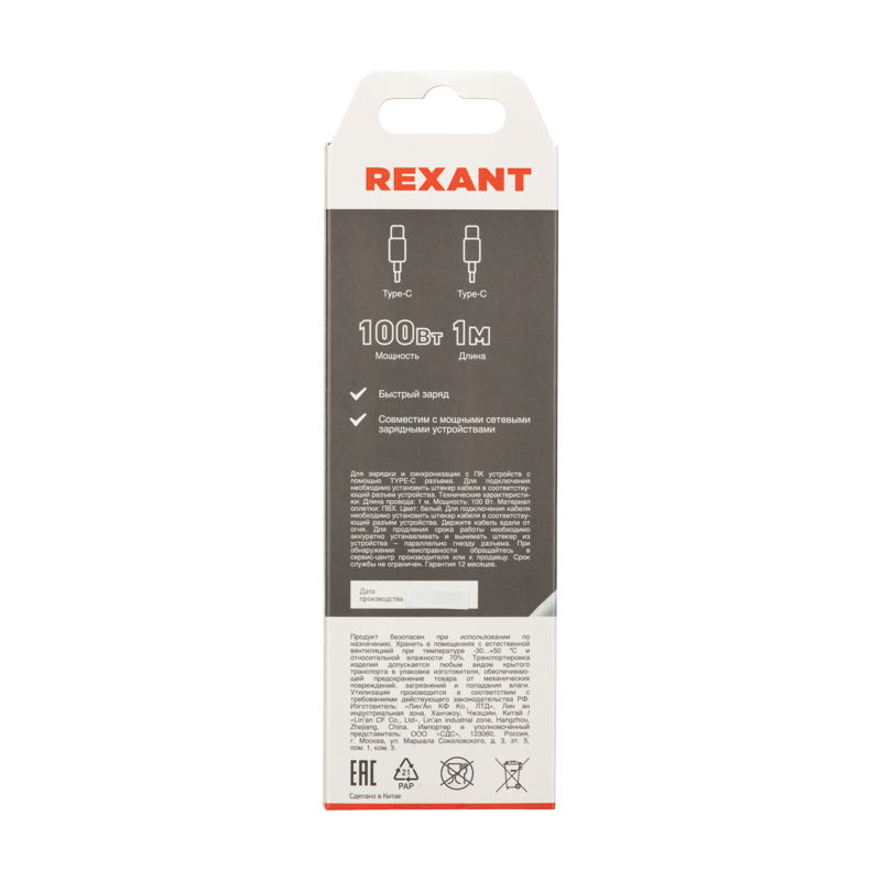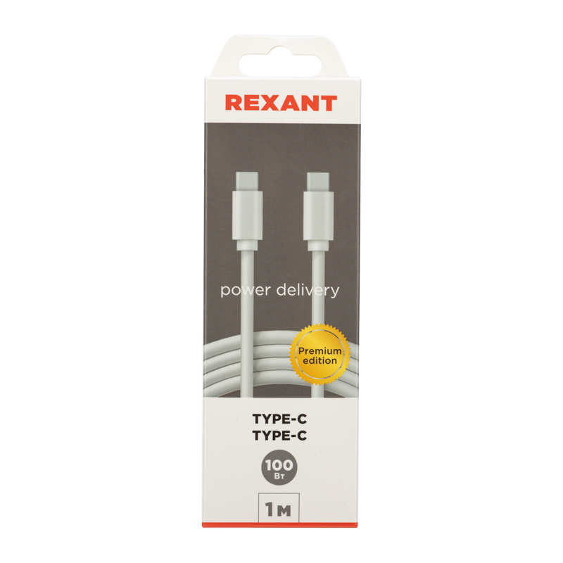 Кабель Type-C - Type-C, 3А, 100Вт, 1м, ПВХ, белый, Power Delivery REXANT
