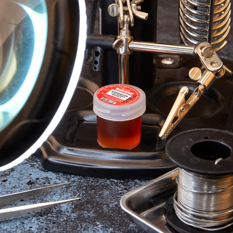 Канифоль сосновая марки А REXANT предназначена для удаления тонких и нестойких оксидов с поверхности под пайку, улучшения растекания жидкого припоя при пайке печатных плат и радиокомпонентов. Изготовлена в соответствии с ГОСТ 19113-84.