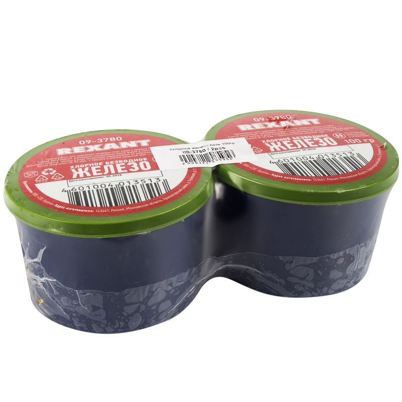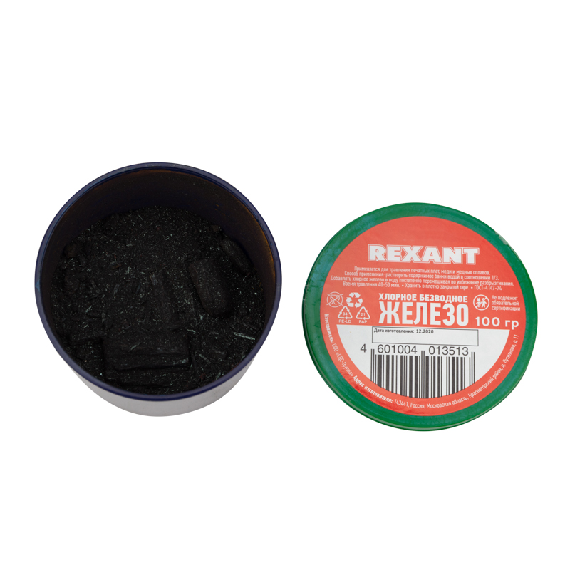 Хлорное железо 100 г REXANT предназначено для травления печатных плат, меди и ее сплавов в электронной промышленности и приборостроении водным раствором.