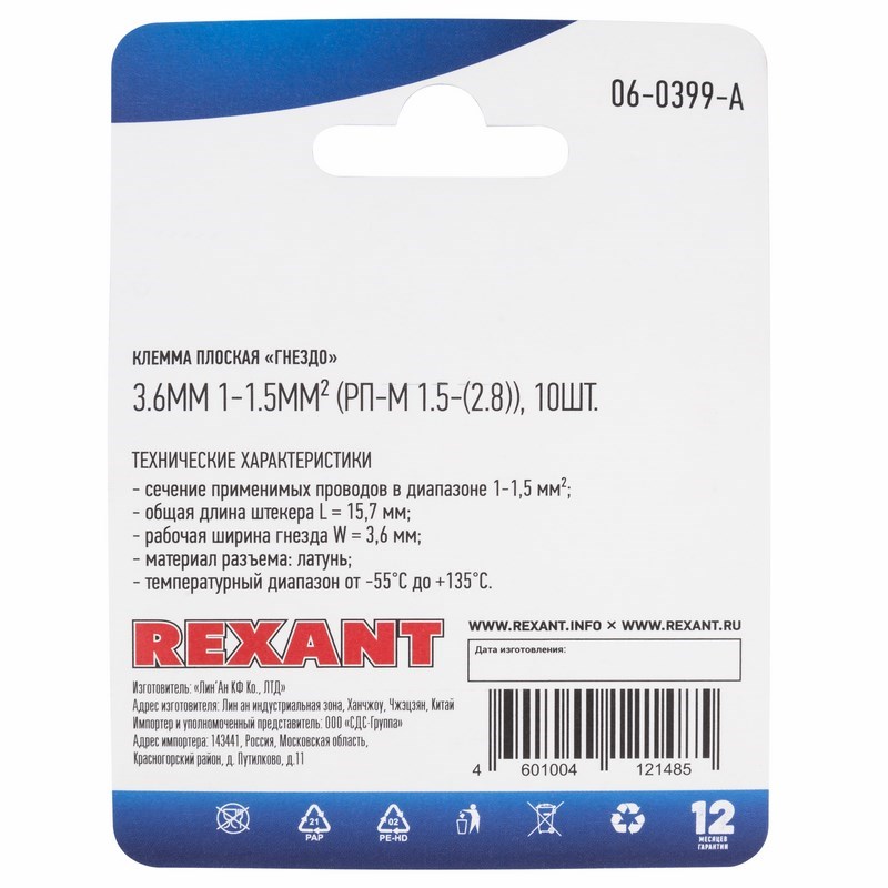 Клемма плоская гнездо 3.6 мм 0.75-1.5 мм² (РП-м 1.5-(2.8)), в упак. 10 шт. REXANT
