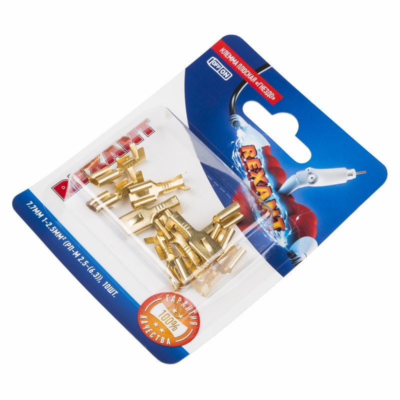Клемма плоская неизолированная (гнездо) REXANT изготовлена из латуни. Обжатие производится специальными пресс-клещами (ht-202; ht-230; ht-301) по жиле и по изоляции, что обеспечит максимальную прочность соединения с проводом. Каждая клемма имеет фиксатор для более прочного механического соединения со штекерным разъемом.