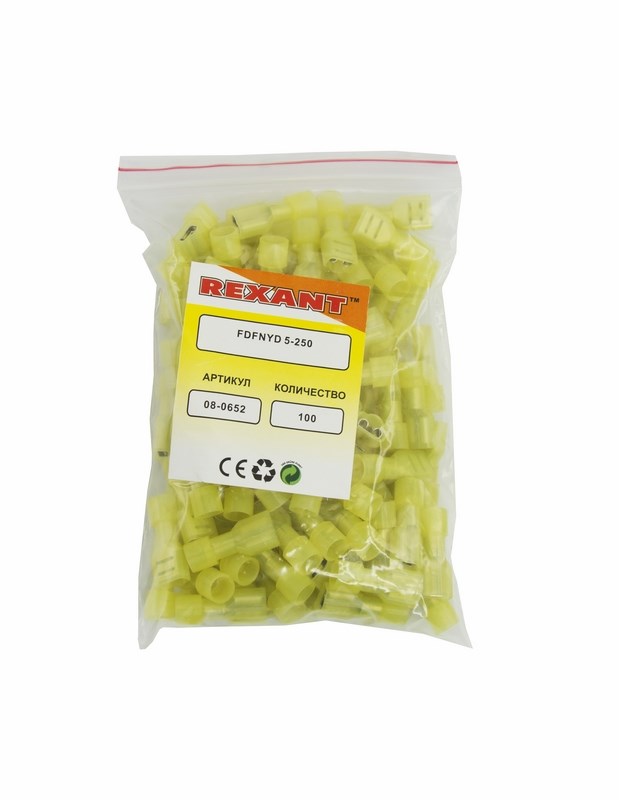 Полностью изолированная плоская клемма REXANT состоит из двух компонентов: металлического коннектора (гнездо) и защитного изолятора, полностью закрывающий штекер. Металлический коннектор изготовлен из латуни, с поверхностным электролитическим лужением, а изолятор клеммы из нейлона, который надежно защищает место обжима кабеля и контактную часть. Цвет изолятора желтый. Обжатие производится специальными пресс-клещами (ht-301) поверх защитного изолятора. Каждая клемма имеет фиксатор замкового типа для более прочного механического соединения с штекерным разъемом.