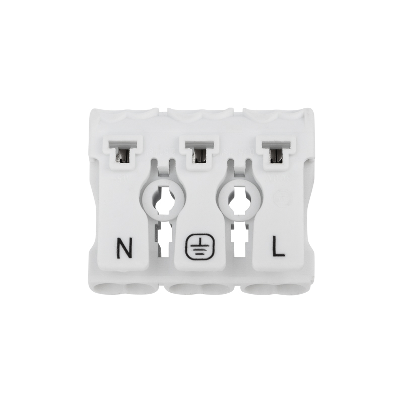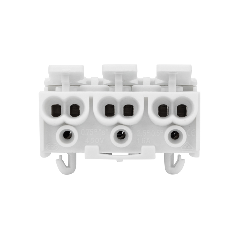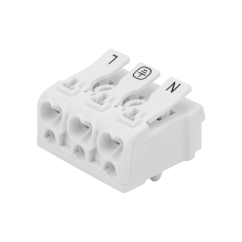 Пружинные трехполюсные клеммы с монтажными ножками REXANT предназначены для присоединения и ответвления одножильных и многожильных медных проводников в электрических цепях переменного тока напряжением до 450 В. Наличие маркировки («фаза», «ноль», «земля») на подвижной части зажима, наличие монтажной ножки. Материал корпуса – самозатухающий ПВХ, материал контакта – электротехническая сталь.