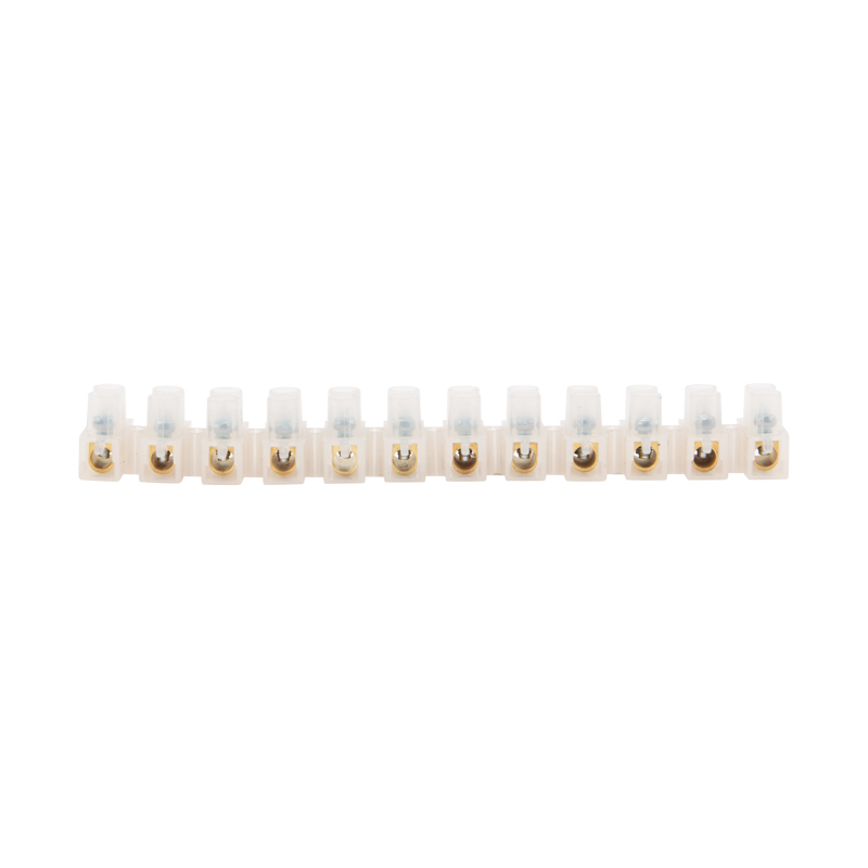 Соединение осуществляется с помощью медных контактов. Кабели и провода фиксируются винтовым зажимом. Клеммная колодка изготовлена из полупрозрачного полиэтилена.