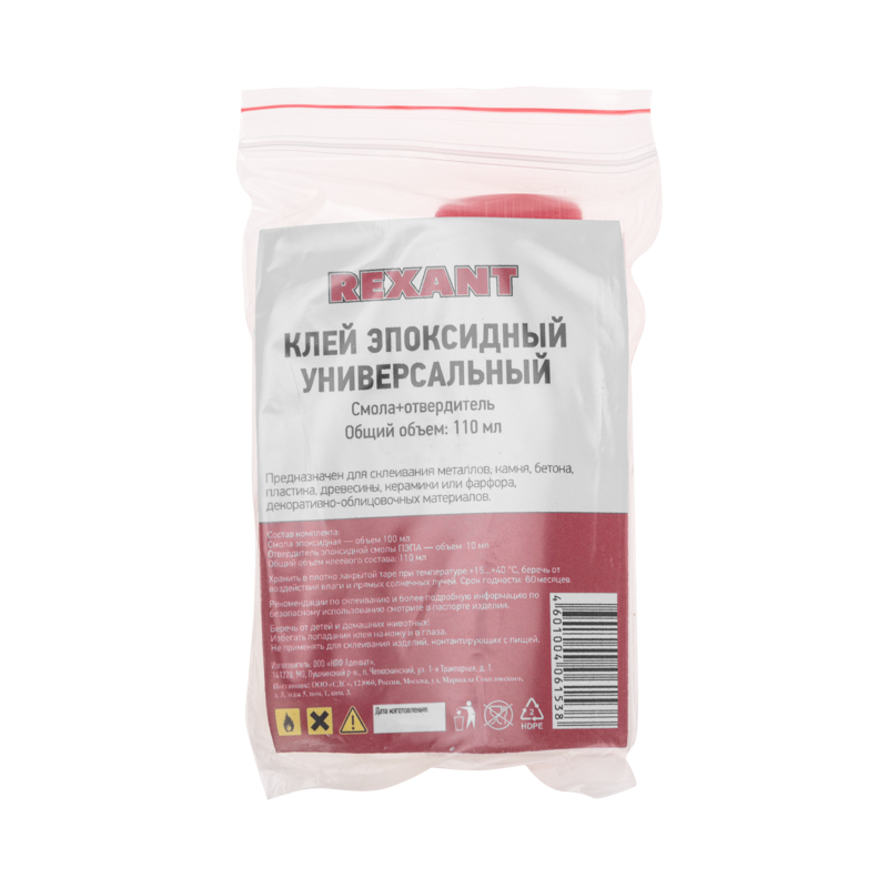 Клей эпоксидный универсальный (смола+отвердитель) 110 мл REXANT предназначен для склеивания металлов, камня, бетона, пластика, древесины, керамики или фарфора, а также для выравнивания поверхностей или избавления от трещин.