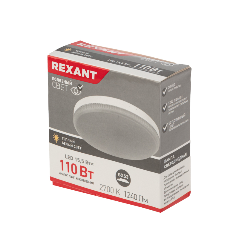 Комплект REXANT, состоящий из лампы и светильника GX53, предназначен для освещения бытовых и административных помещений в подвесных и натяжных потолках.