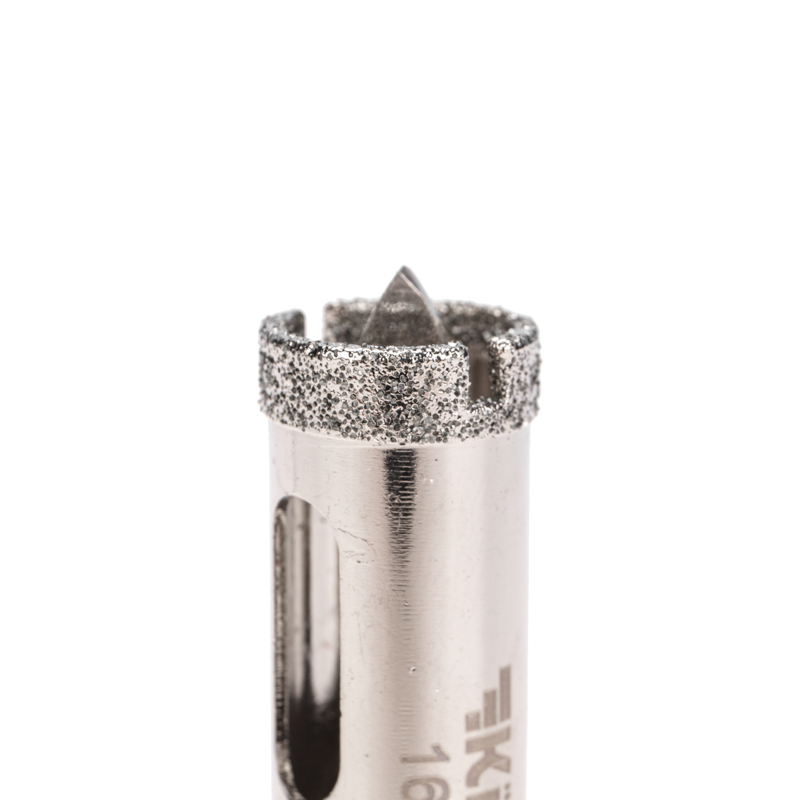 Алмазная коронка диаметром 16 мм используется при сверлении керамогранита, керамики, стекла. Наличие центровочного сверла обеспечивает точное позиционирование коронки на поверхности и помогает избежать смещения во время работ.