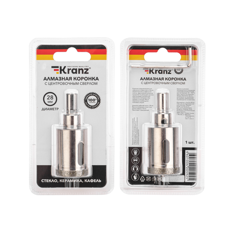 Алмазная коронка диаметром 28 мм используется при сверлении керамогранита, керамики, стекла. Наличие центровочного сверла обеспечивает точное позиционирование коронки на поверхности и помогает избежать смещения во время работ.