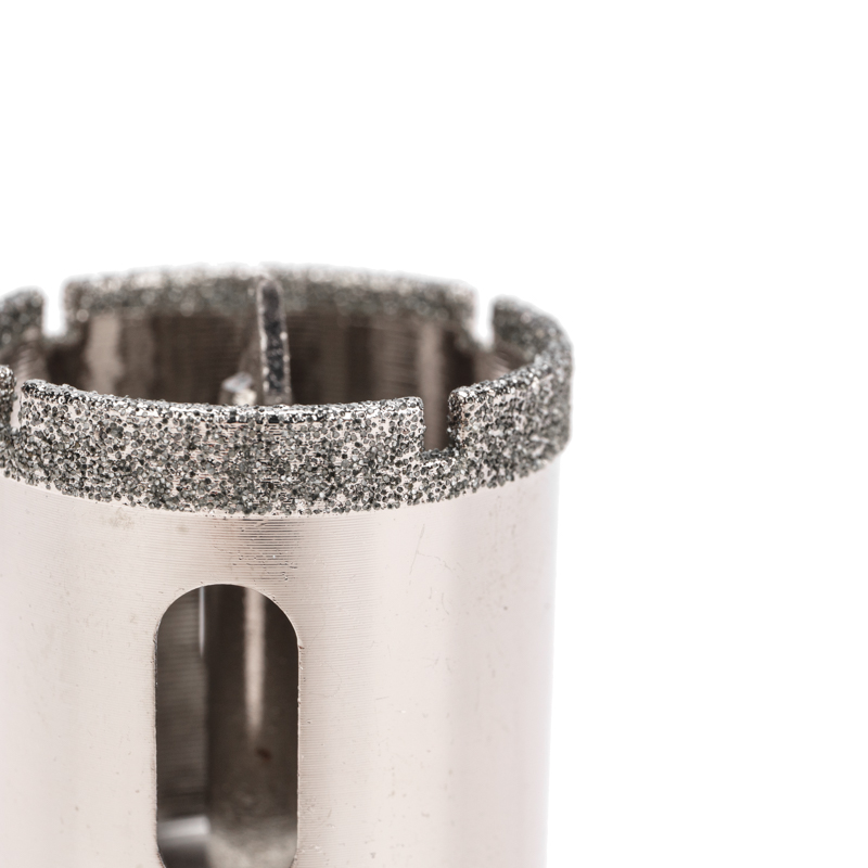 Покрытие алмазной коронки выполнено гальваническим способом в два слоя, что гарантирует эффективное сверление и продолжительный рабочий ресурс инструмента. Равномерное распределение алмазов по режущей кромке обеспечивает аккуратное сверление материала без трещин и сколов.