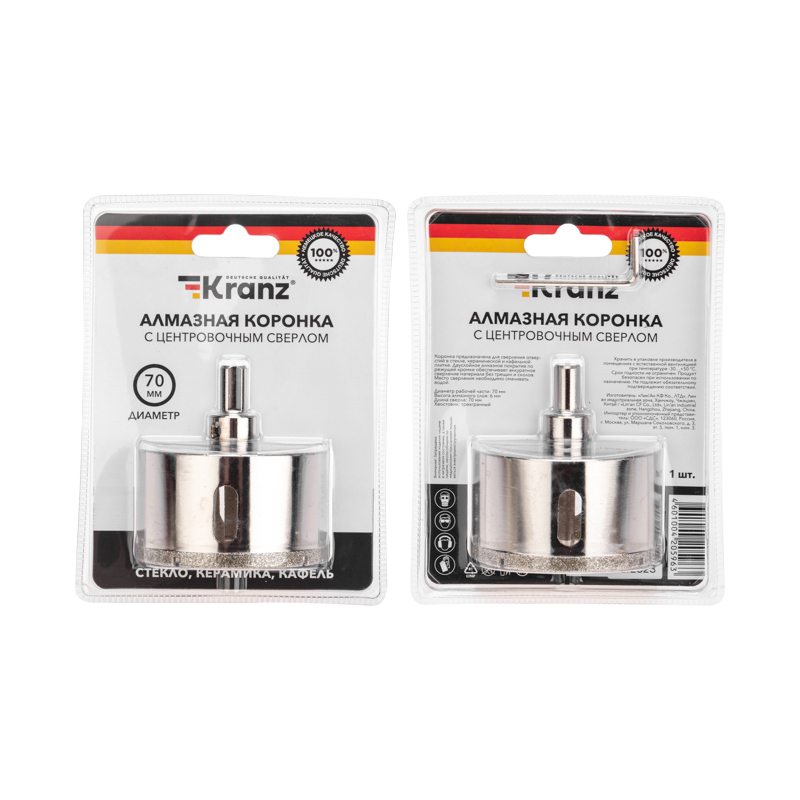 Алмазная коронка диаметром 70 мм используется при сверлении керамогранита, керамики, стекла. Наличие центровочного сверла обеспечивает точное позиционирование коронки на поверхности и помогает избежать смещения во время работ.