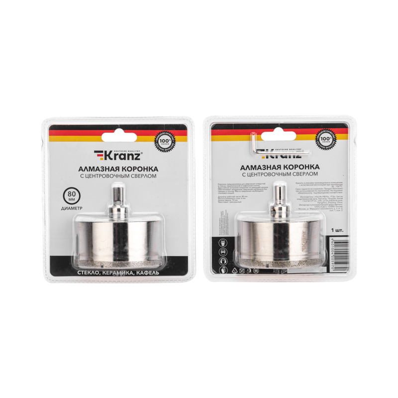 Алмазная коронка диаметром 80 мм используется при сверлении керамогранита, керамики, стекла. Наличие центровочного сверла обеспечивает точное позиционирование коронки на поверхности и помогает избежать смещения во время работ.