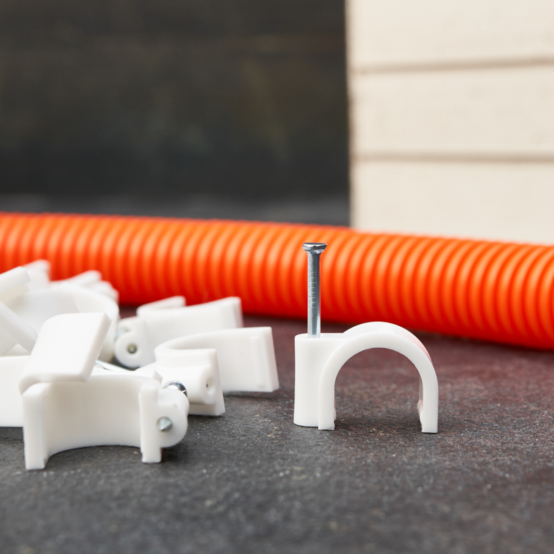 Представляет собой дугообразную скобу белого цвета, выполненную из качественного пластика, с гвоздем в специальном отверстии. Скоба используется для мгновенного и надежного крепления проводов и кабелей к поверхностям стен, несущих конструкций и потолков. Гвоздь выполнен из закаленной стали, что позволяет закрепить его даже в плотной и твердой древесине без риска погнуть или сломать.