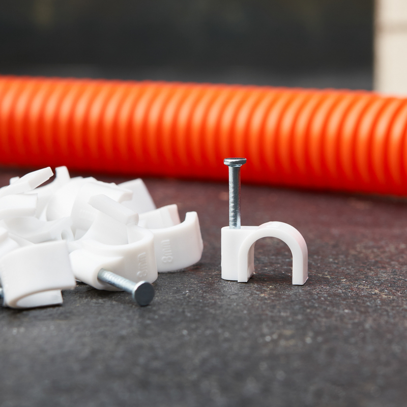 Круглый крепеж 8 мм с гвоздем предназначен для фиксации круглого кабеля к деревянной поверхности. Такой крепеж будет особенно полезен для использования на даче или в частном деревянном доме.