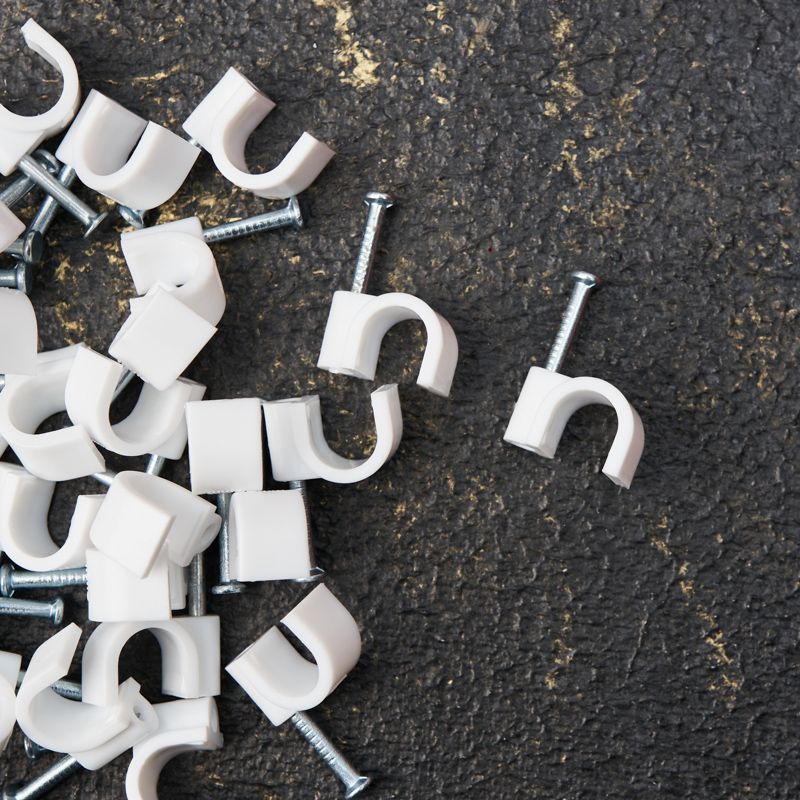 Представляет собой дугообразную скобу белого цвета, выполненную из качественного пластика, с гвоздем в специальном отверстии. Скоба используется для мгновенного и надежного крепления проводов и кабелей к поверхностям стен, несущих конструкций и потолков. Гвоздь выполнен из закаленной стали, что позволяет закрепить его даже в плотной и твердой древесине без риска погнуть или сломать.