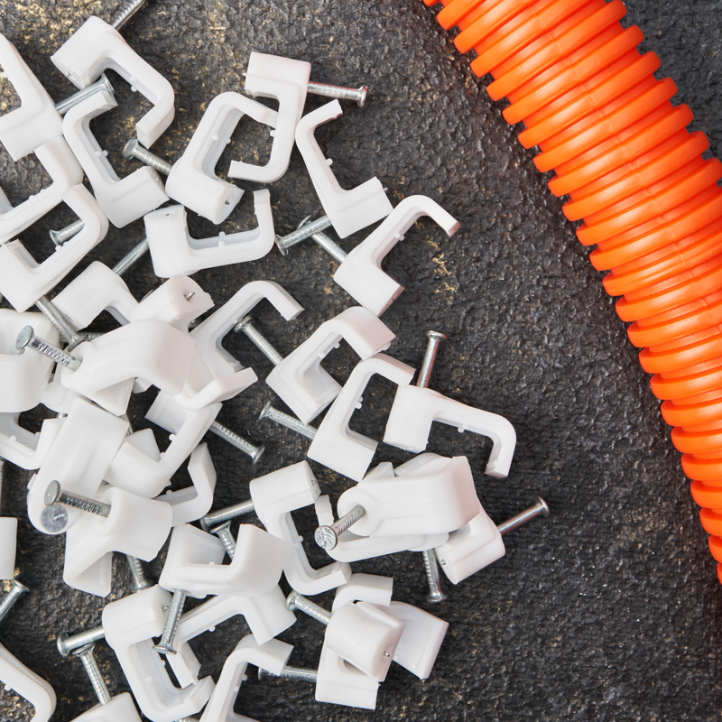 Представляет собой выполненную из качественного пластика П-образную скобу белого цвета, в монтажное отверстие которой уже вставлен гвоздь. Скоба используется для мгновенного и надежного крепления проводов и кабелей к поверхностям стен, несущих конструкций и потолков. Гвоздь выполнен из закаленной стали, что позволяет закрепить его даже в плотной и твердой древесине без риска погнуть или сломать.